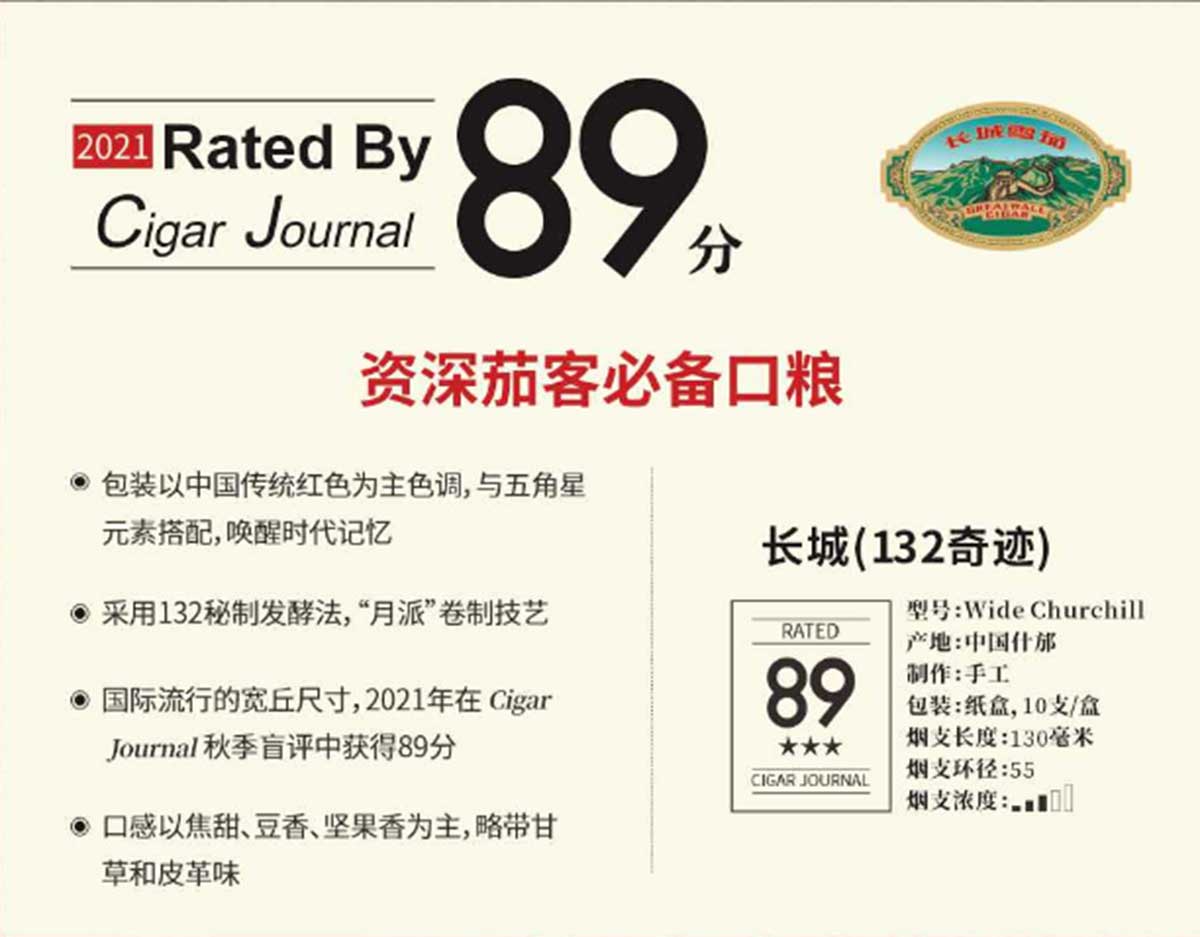 在Cigar Journal秋季盲评和Cigars Lover杂志盲评中分别获得89分和90分的高分,成为中国唯一一款获得双盲评高分的雪茄。132奇迹以其均衡的香气、顺畅的抽吸体验,以及深邃的口感,成为了资深茄客必备的口粮茄。