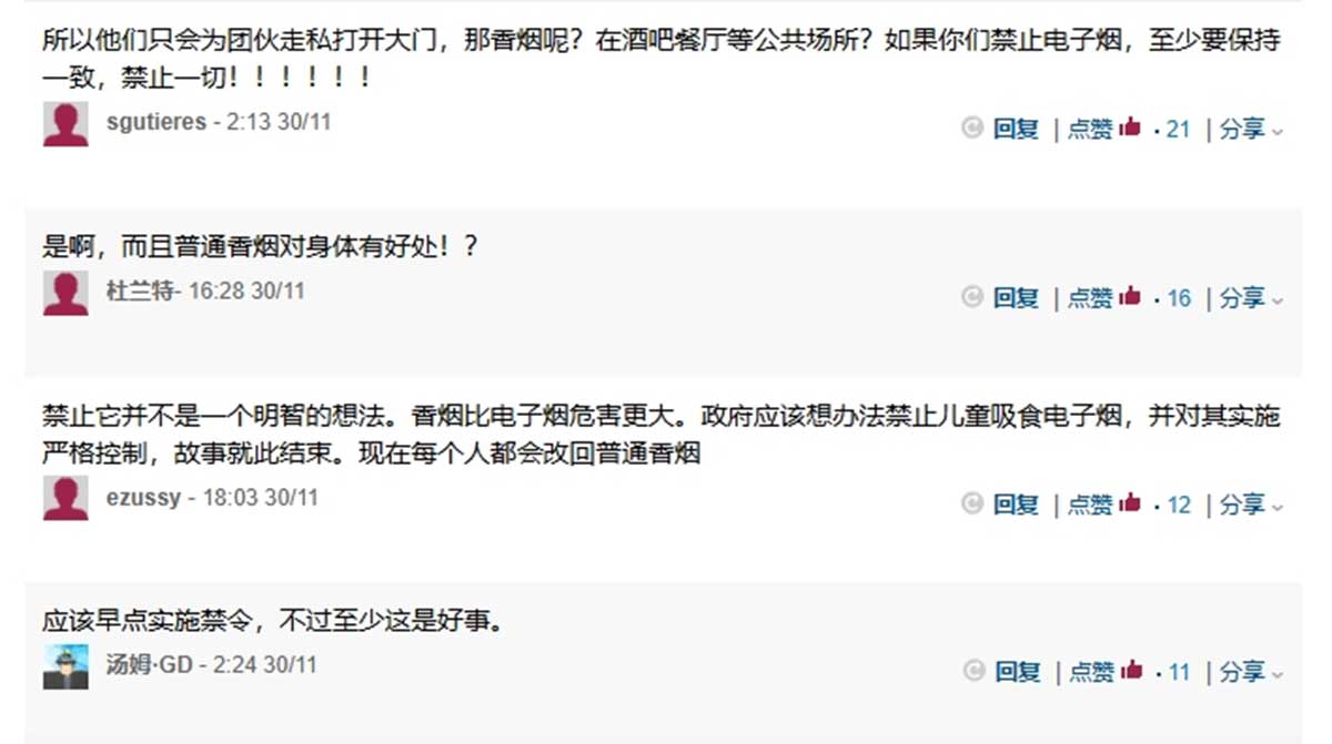 此次越南国会通过电子烟和加热卷烟的全面禁令,部分越南公民表示支持,他们认为禁令有利于年轻一代更加健康成长,也有部分人把未成年人使用电子烟归咎于监护人监护不力,而不是电子烟本身,禁令只会助长电子烟走私和黑市,同时越南政府还损失了税收。