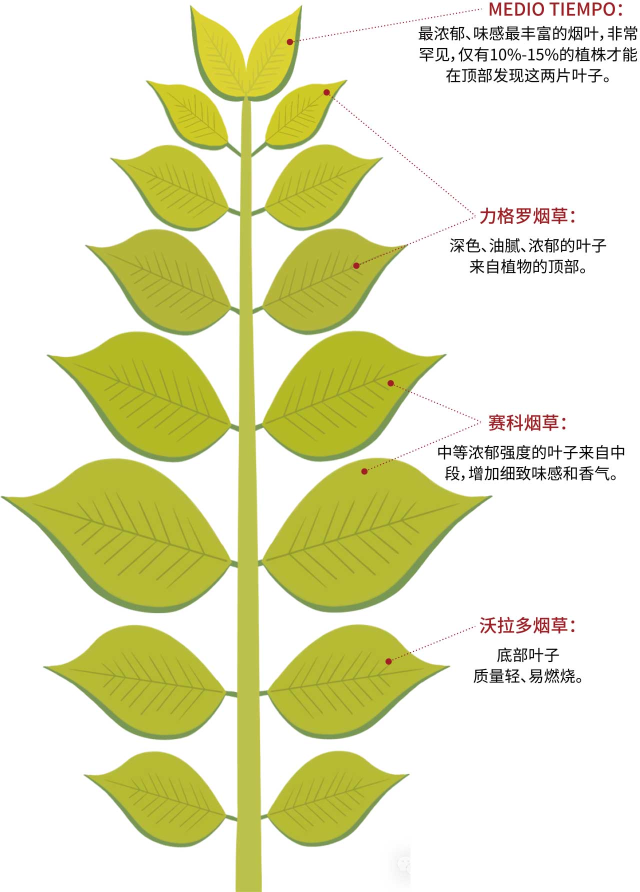 认识雪茄的风味,就要先认识一整个植株的部位,这是雪茄调配的基本原则之所在。以上讲的三个部位是三个大部位,每个部位又可以细分几个小部位。我重新绘制了双语版的雪茄烟叶植株部位图,读者可以参考。