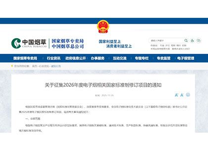 国家烟草专卖局:关于征集2026年度电子烟相关国家标准制修订项目的通知2025-12-04国家烟草专卖局:关于征集2026年度电子烟相关国家标准制修订项目的通知