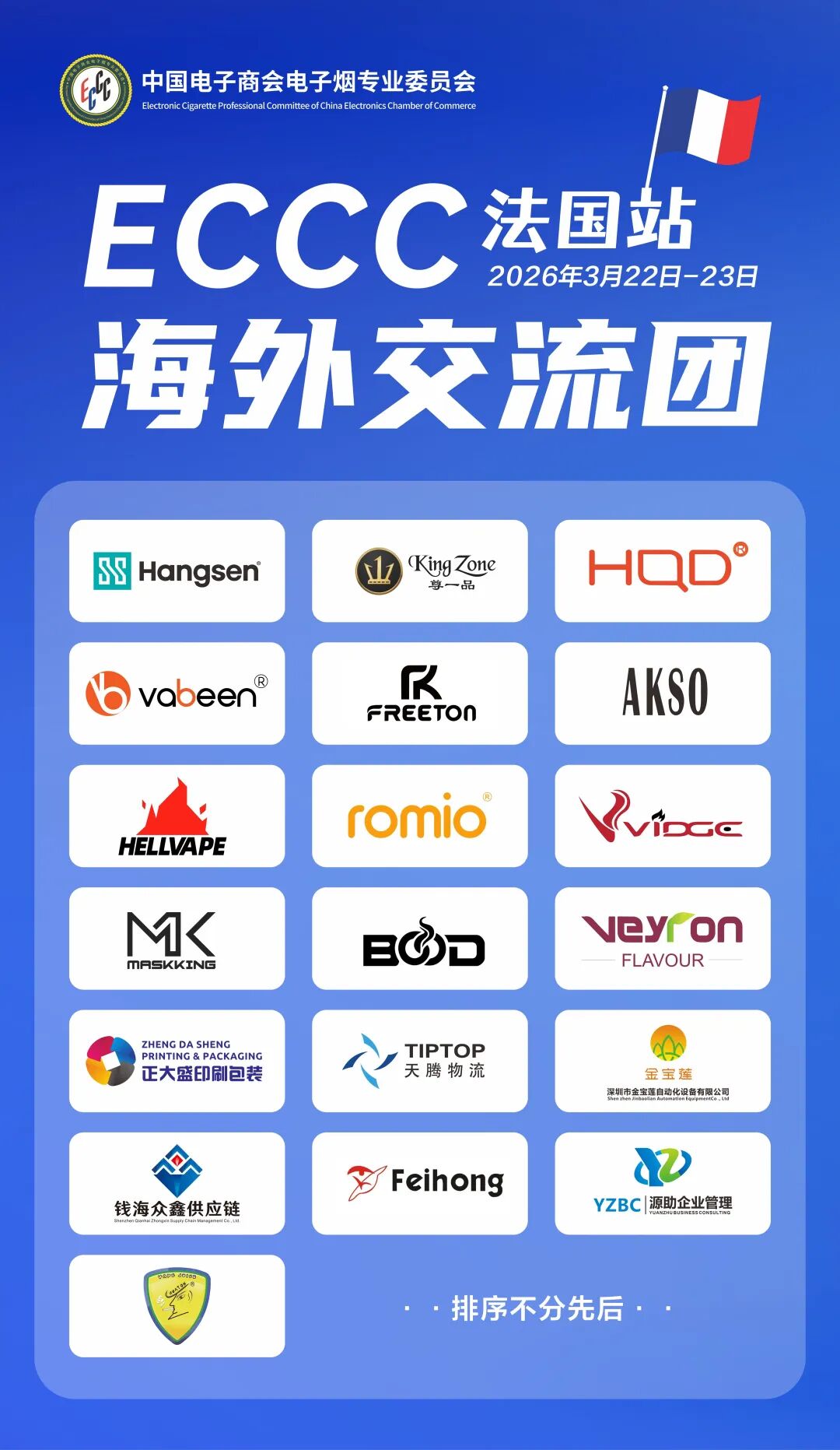 当地时间3月22日至23日,法国规模最大、知名度最高的电子烟专业展会——VAPEXPO FRANCE 2026在巴黎凡尔赛门展览中心盛大举行。作为展会官方战略合作伙伴,电子烟专委会(ECCC)携数十家会员企业组团参展,以专业服务与资源链接,助力企业深耕法国及欧盟市场。